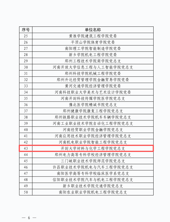 近日,从中共河南省委教育工作委员会文件获悉,开封大学材料与化学工程学院党总支获批第三批“全省高校党建工作标杆院系”培育创建单位,这是该学院教工一党支部获评第二批“全省党建工作样板支部”之后,再次获批省级党建工作重要荣誉。
