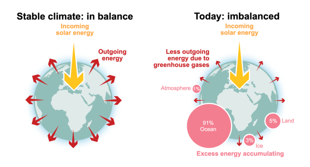 在气候稳定情况下,每年来自太阳辐射的能量与从地球逸出的能量大致相等,然而,温室气体浓度不断上升打破了这种平衡。