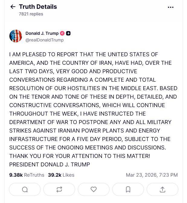 当天早些时候,就在所谓的“最后48小时最后通牒”结束前,美国总统特朗普突然在其社交媒体平台“真实社交”上发文称,“美国和伊朗在过去两天进行了非常良好和富有成效的对话”,对话将持续至本周末。