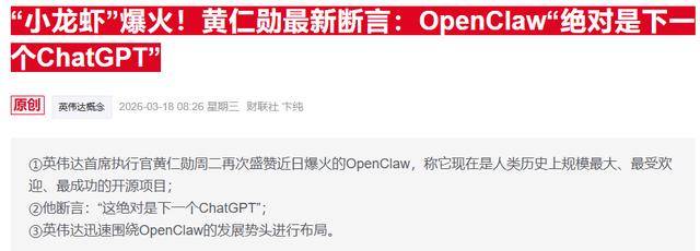黄仁勋在接受采访时表示,OpenClaw“绝对是下一个ChatGPT”。