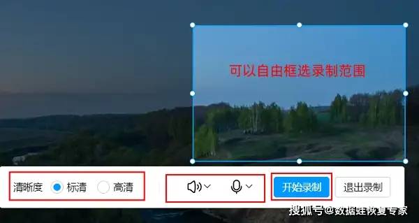 步骤2:进入屏幕录制模式后,要先完成基础配置:鼠标拖拽划定录制区域,音频可选系统声音、麦克风声音,或两者同时录制;