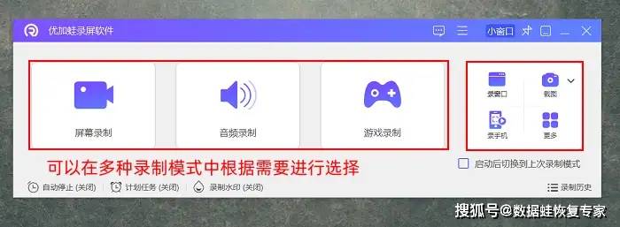 步骤1:打开优加蛙录屏软件,主界面包含多种录制模式,比如屏幕录制、区域录制等,可根据网课、会议、游戏等场景选择。
