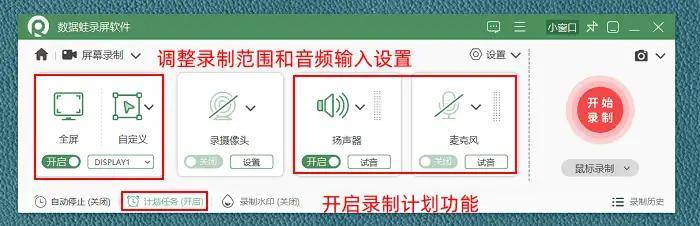 操作步骤:打开数据蛙录屏软件,选定适配的录制模式,接着调整好录制区域和音频来源,点击界面中的【开始录制】按钮即可。