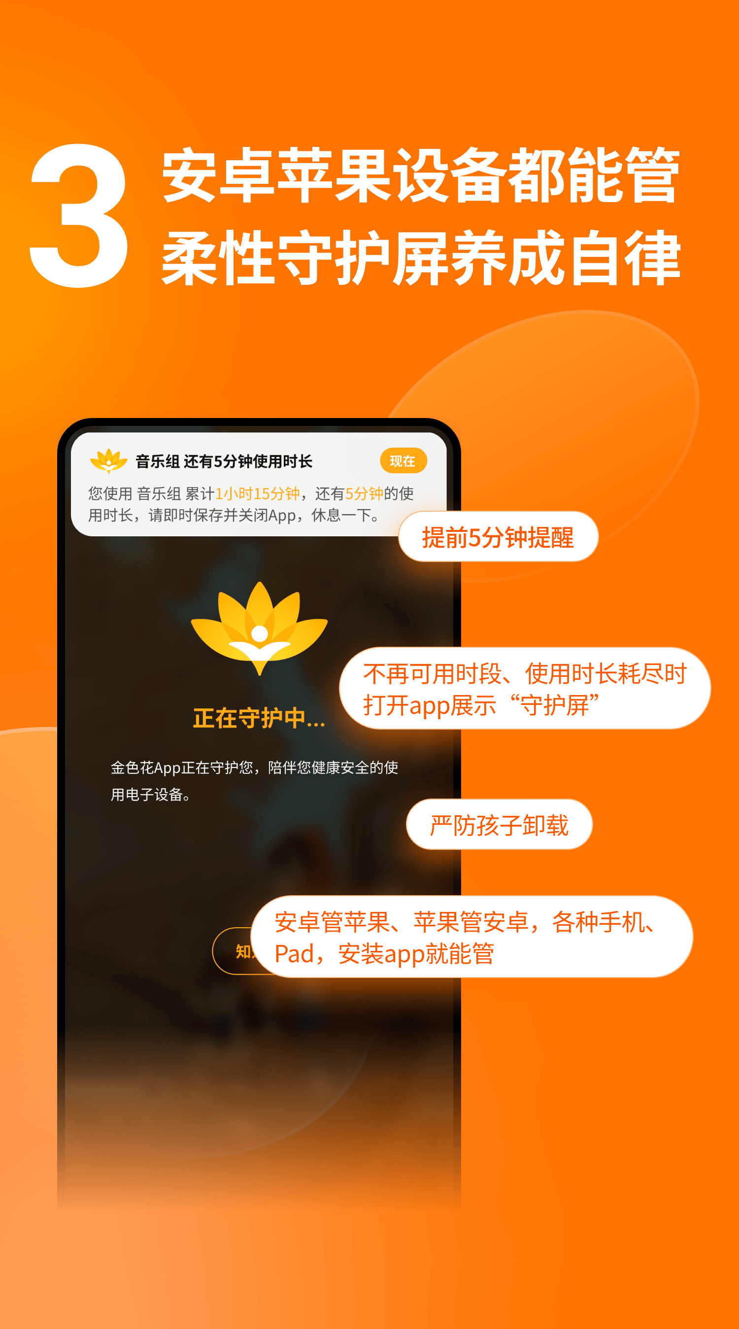 家长在应用商店下载安装金色花守护后,只需要用手机号完成注册,绑定孩子的手机设备,就能快速进入管控设置。