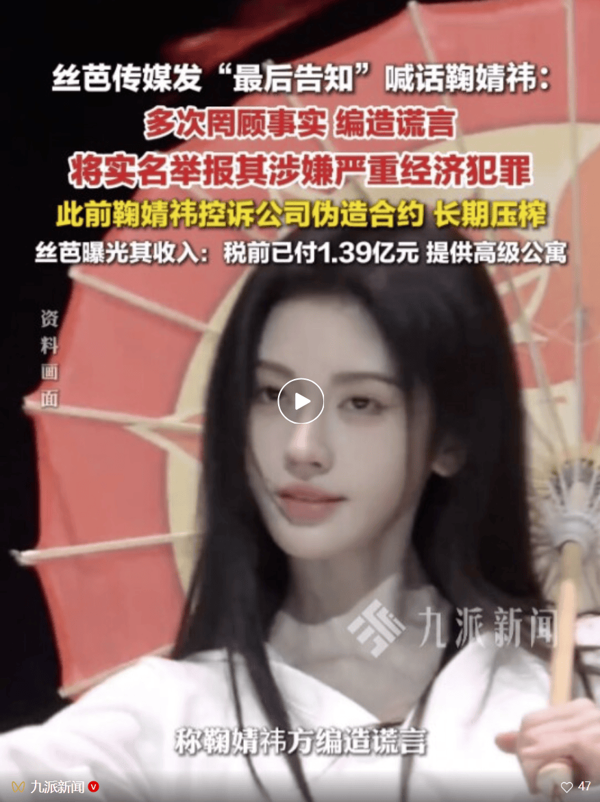 2025年12月18日,据白鹿视频报道,丝芭传媒发文“致艺人鞠婧祎的最后告知”。
