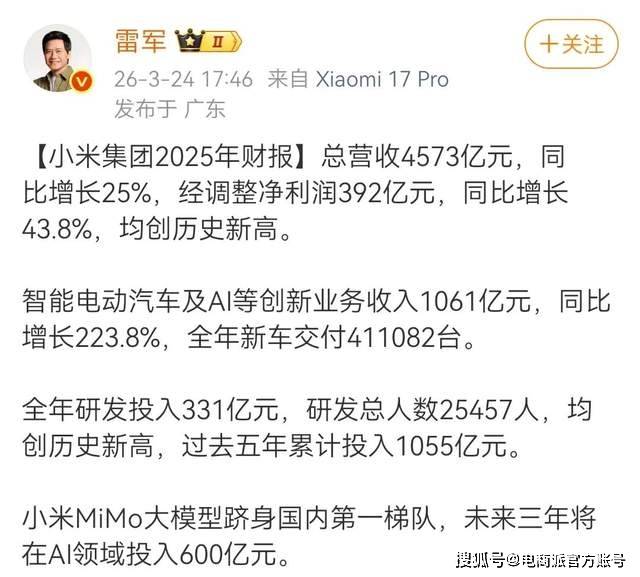 财报数据显示,小米2025年总营收4573亿元,同比增长25.0%;