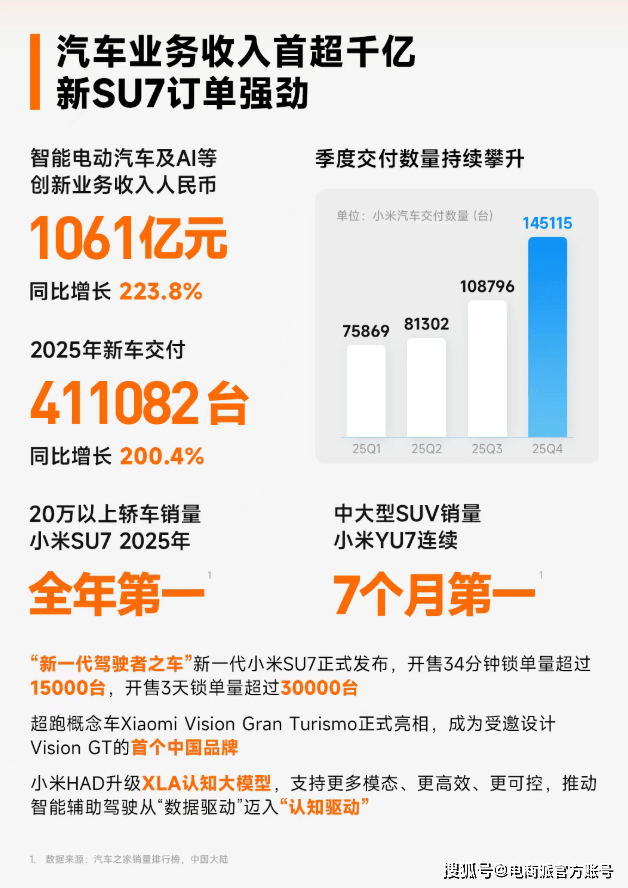 具体而言,全年新车交付411082台,同比增长200.4%,小米SU7位列2025年国内20万以上轿车销量冠军,小米YU7连续7个月位列国内中大型SUV销量第一。