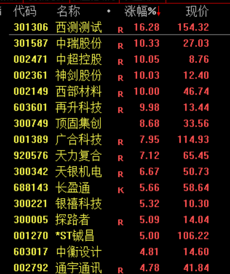 商业航天概念股局部拉升,神剑股份、中超控股、西部材料、再升科技涨停。