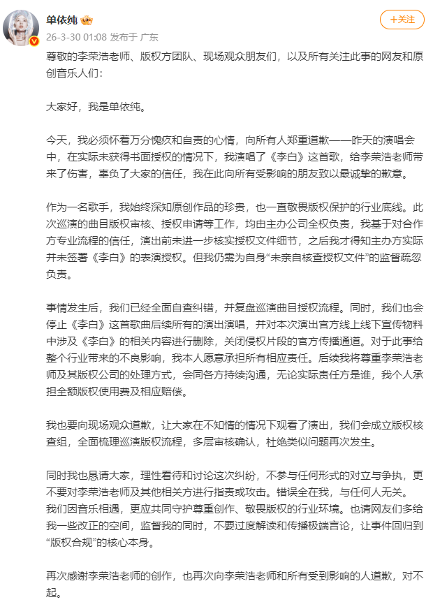 30日凌晨,单依纯发长文向李荣浩道歉,她称此次巡演的曲目版权审核、授权申请等工作,均由主办公司全权负责,自己演出前未进一步核实授权文件细节,之后才得知主办方实际并未签署《李白》的表演授权。