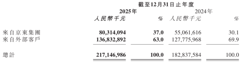 2025年,京东物流来自京东集团的收入为803亿元,同比增长46%,收入占比为37%。