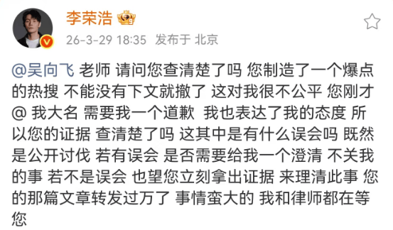 吴向飞老师,请问您查清楚了吗?您制造了一个爆点的热搜,不能没有下文就撤了,这对我很不公平,您刚才@ 我大名,需要我一个道歉,我也表达了我的态度,所以您的证据,查清楚了吗?这其中是有什么误会吗?既然是公开讨伐,若有误会,是否需要给我一个澄清,不关我的事,若不是误会,也望您立刻拿出证据来理清此事,您的那篇文章转发过万了,事情蛮大的,我和律师都在等您。