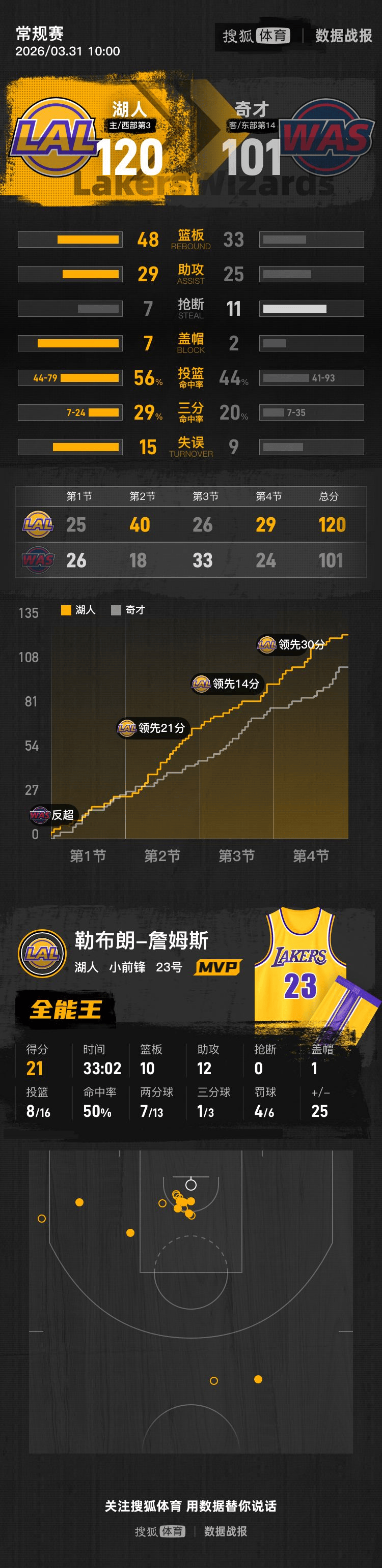 【搜狐体育战报】北京时间3月31日NBA常规赛,主场作战的湖人以120-101击败奇才,湖人取得3连胜,奇才遭遇3连败。
