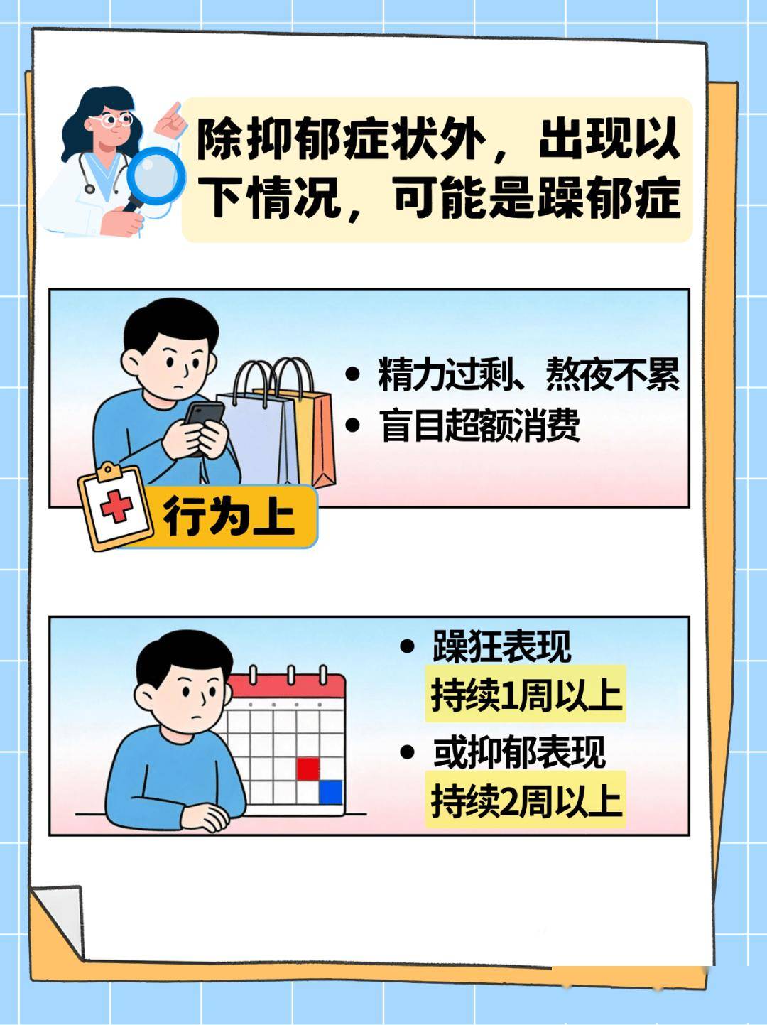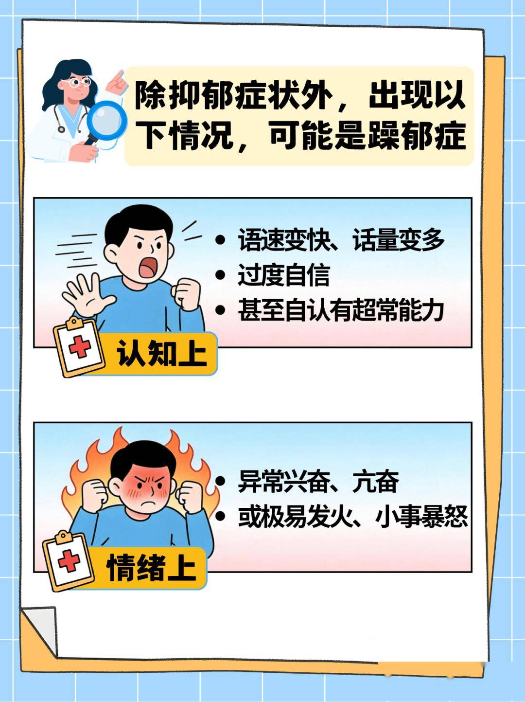 躁郁症全称为双相情感障碍,患者会在(轻)躁狂和抑郁两种情绪间反复切换。