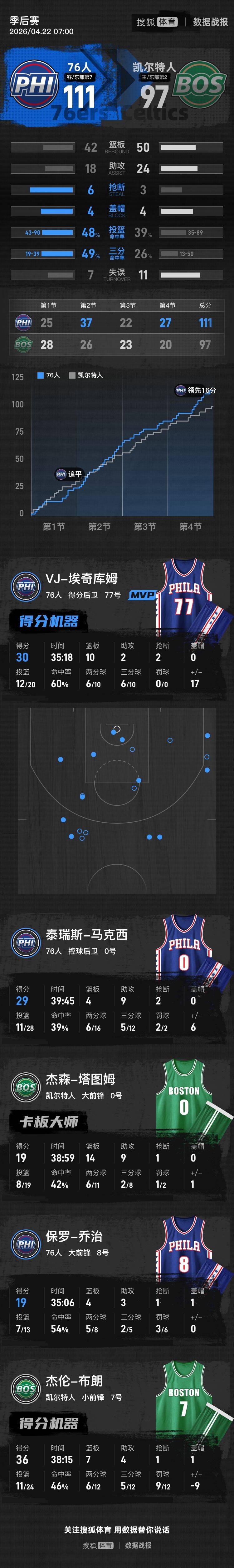 【搜狐体育战报】北京时间4月22日NBA季后赛首轮G2,客场作战的76人以111-97击败凯尔特人,将总比分扳成1-1平。
