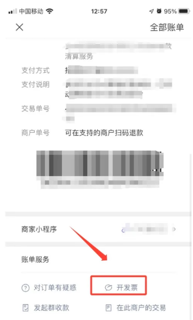 2、之后进入到账单详情功能页面,滑动到最底部点击【开发票】;