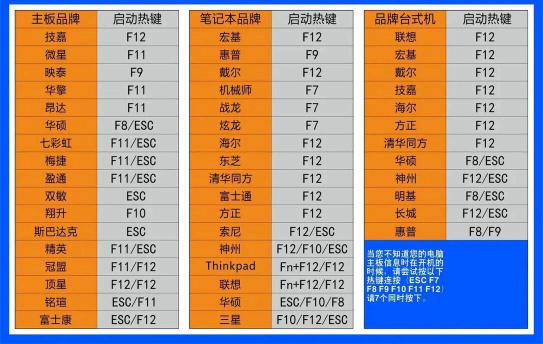 启动盘制作完成之后,重启电脑,在电脑重启过程当中根据自己主板的型号,按键盘上的选择启动盘快捷键,各个品牌的启动盘快捷键都不一样,大家可以根据这张图来对应选择。