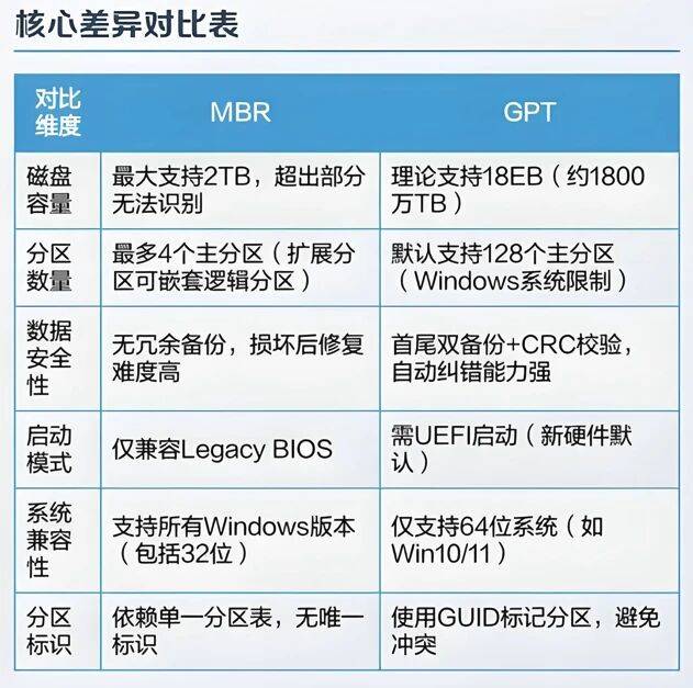 分区类型处有MBR和GPT两个选项,这张图是它们的区别,如果是老设备选择MBR,如果是新设备选择GPT。