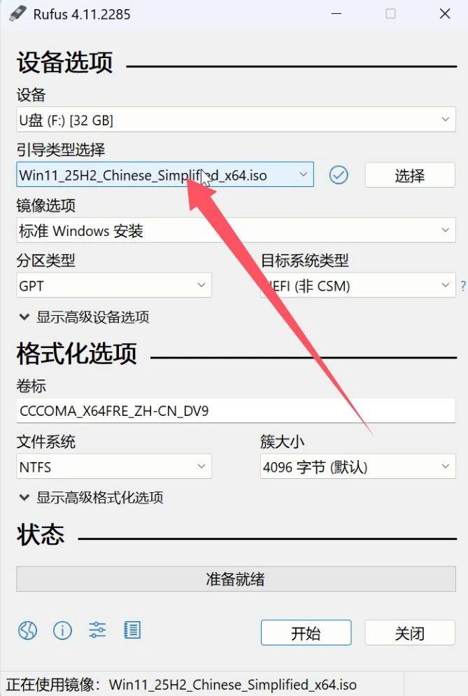 引导类型选择处选择我们下载好的windows11镜像,镜像选择处选择标准windows安装。