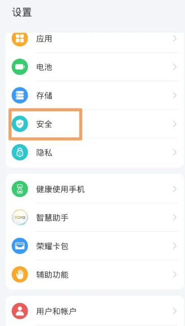 2、之后跳转到设置功能页面,滑动页面找到【安全】服务;
