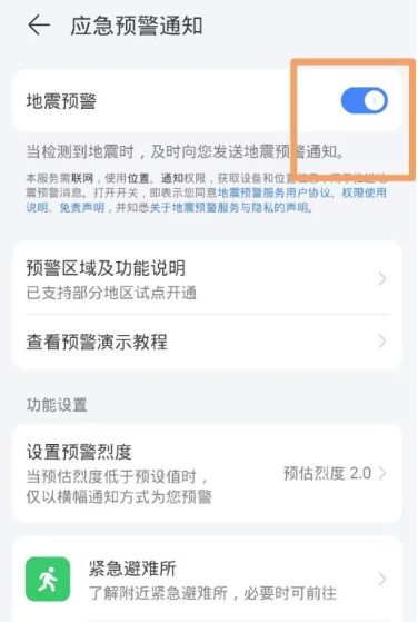 4、最后在应急预警通知功能页,点击地震预警后方的按钮滑动即可打开。