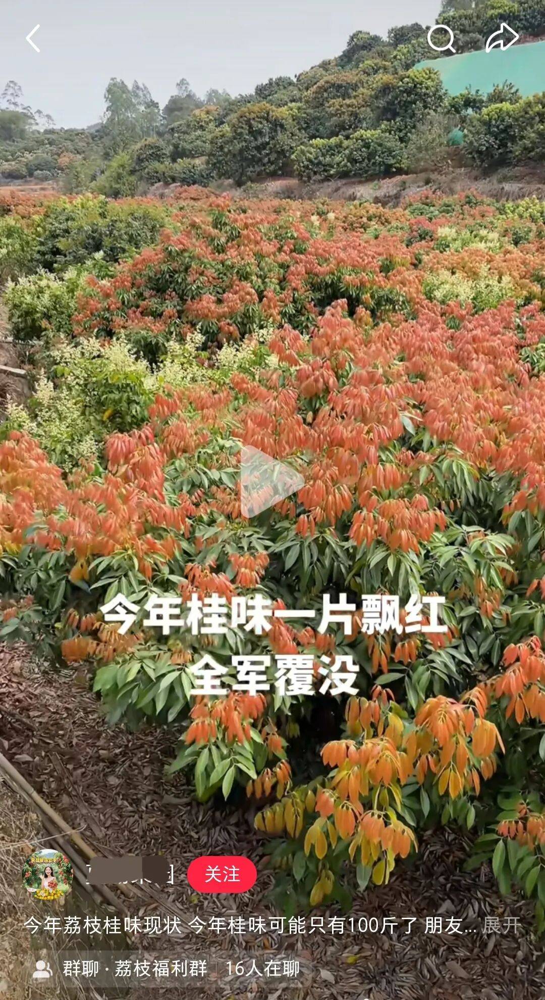 附近“深宝果园”农场“主理人”小松早在今年1月就在网上发帖“预警”称,今年的荔枝收成不乐观。