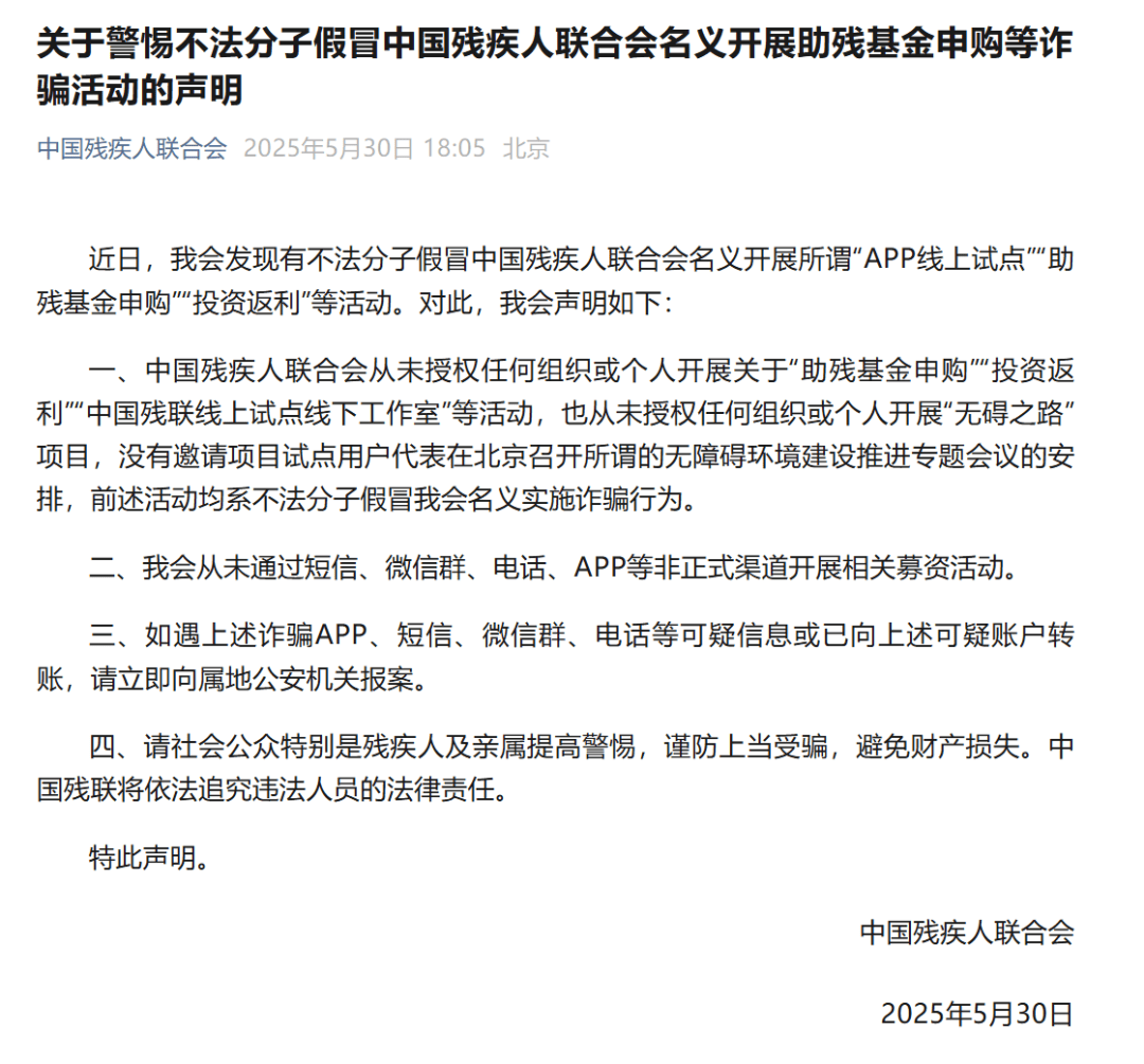 早在去年5月,中国残疾人联合会就曾发布声明,“从未授权任何组织或个人开展关于‘助残基金申购’‘投资返利’‘中国残联线上试点线下工作室’等活动。