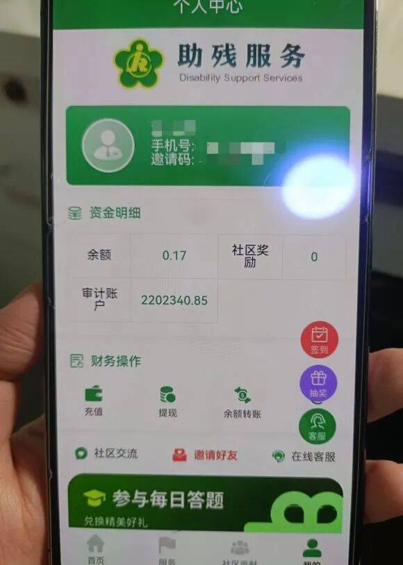 这个“助残服务”软件,页面不仅有资金明细,还有充值、提现等操作模块。