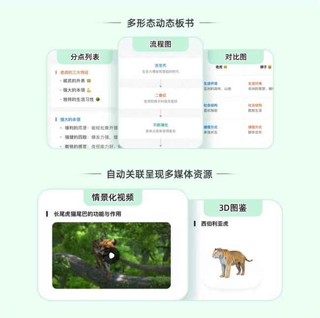 其中,在动态板书系统里,闪电AI可以在用语音为孩子讲解知识的同时,梳理动态板书,将逻辑思维可视化,用分点列表、流程图、对比表等形式展示知识结构;