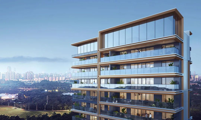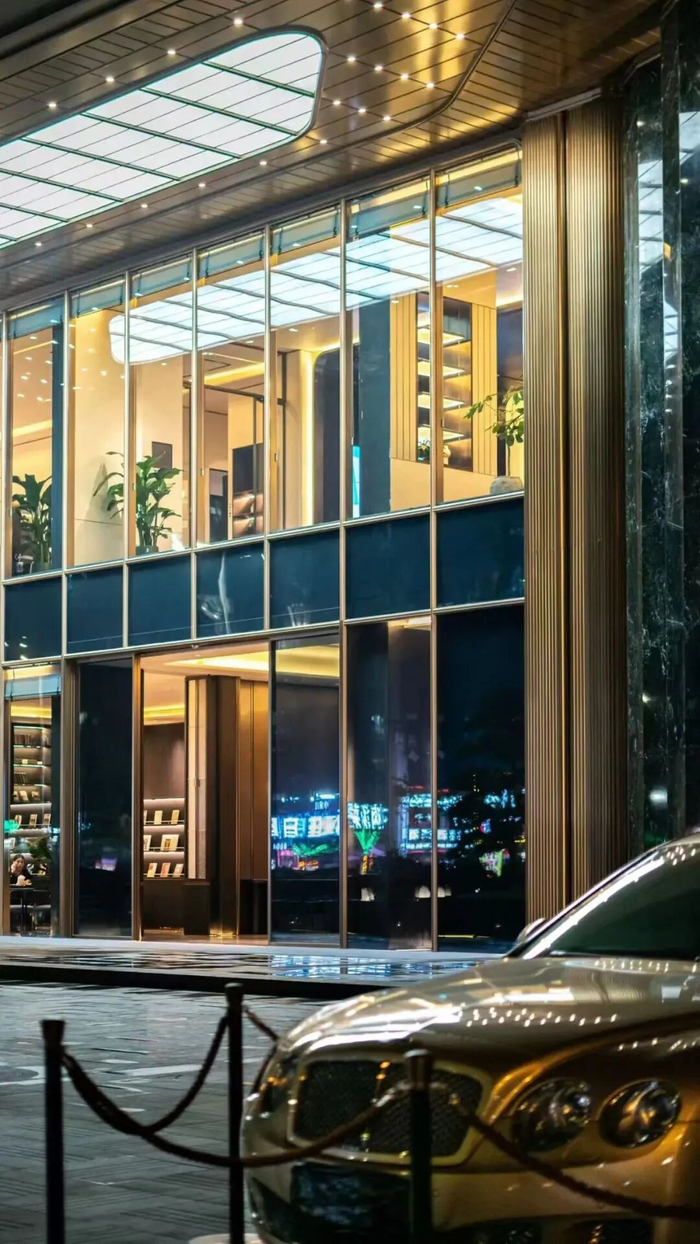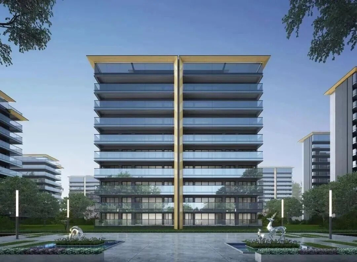 安缦美学风格的外立面,大面积使用玻璃幕墙和无框玻璃阳台栏杆,最大化采光与景观视野,让室内外空间边界变得模糊,营造出通透轻盈的视觉效果。
