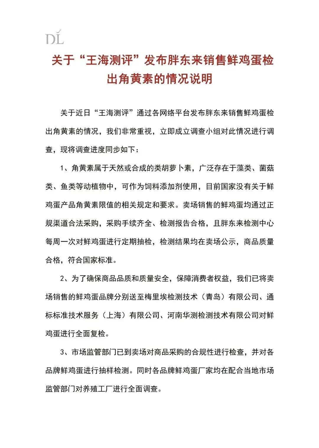 目前市场监管部门的相关调查以及第三方复检还未出结果,如果最终的调查结果显示鲜鸡蛋存在问题,会第一时间公示结果,并立即启动下架召回程序,依法承担相应法律责任。
