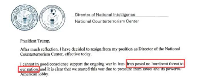 肯特在社交媒体上公布了他本人致特朗普的信件,他在信件中说:“凭良心讲,我无法支持正在进行的对伊战争。