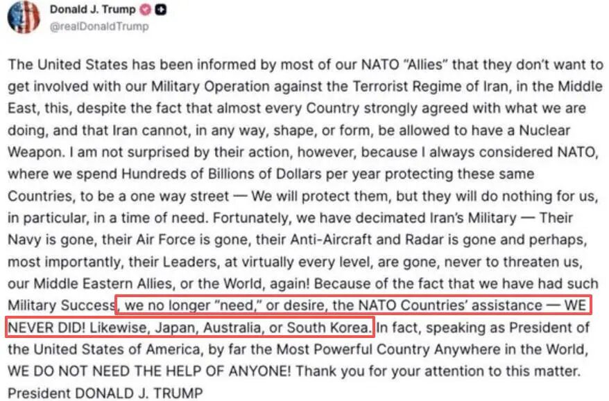 △当地时间17日,美总统特朗普在社交媒体上发文,称“我们不再需要或期待任何北约国家的帮助”。特朗普在文中明确写道:“他们(北约)不会为美国做任何事,尤其是在美国有求于他们的时候。