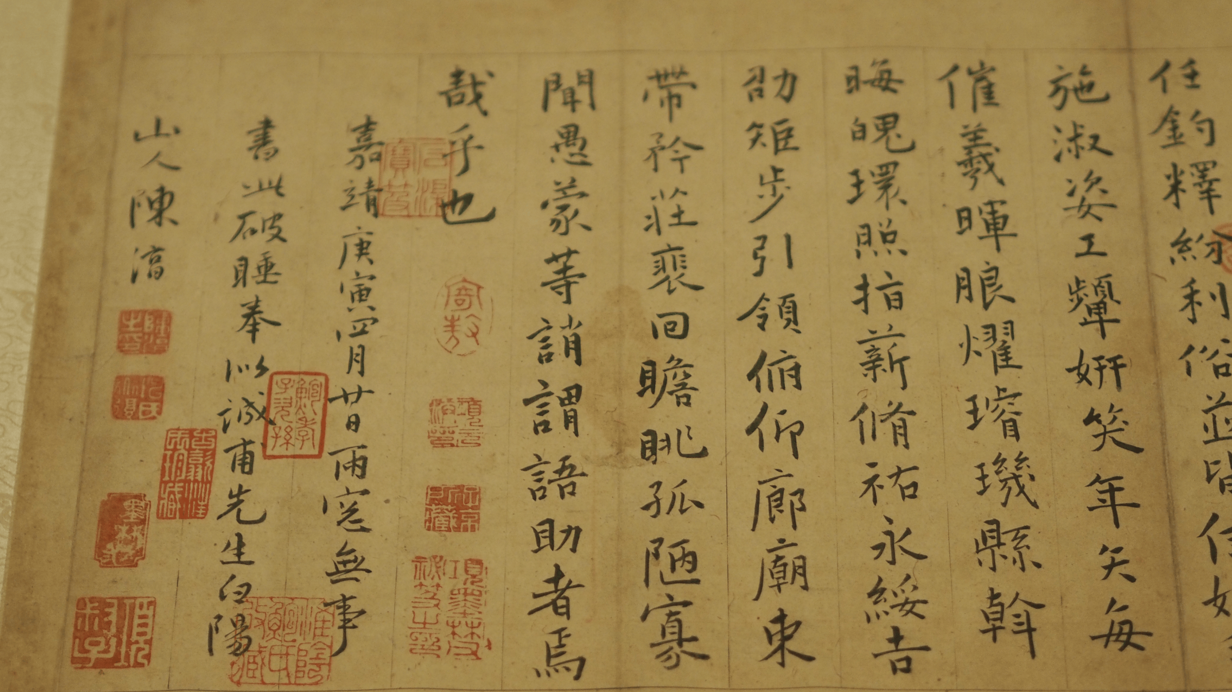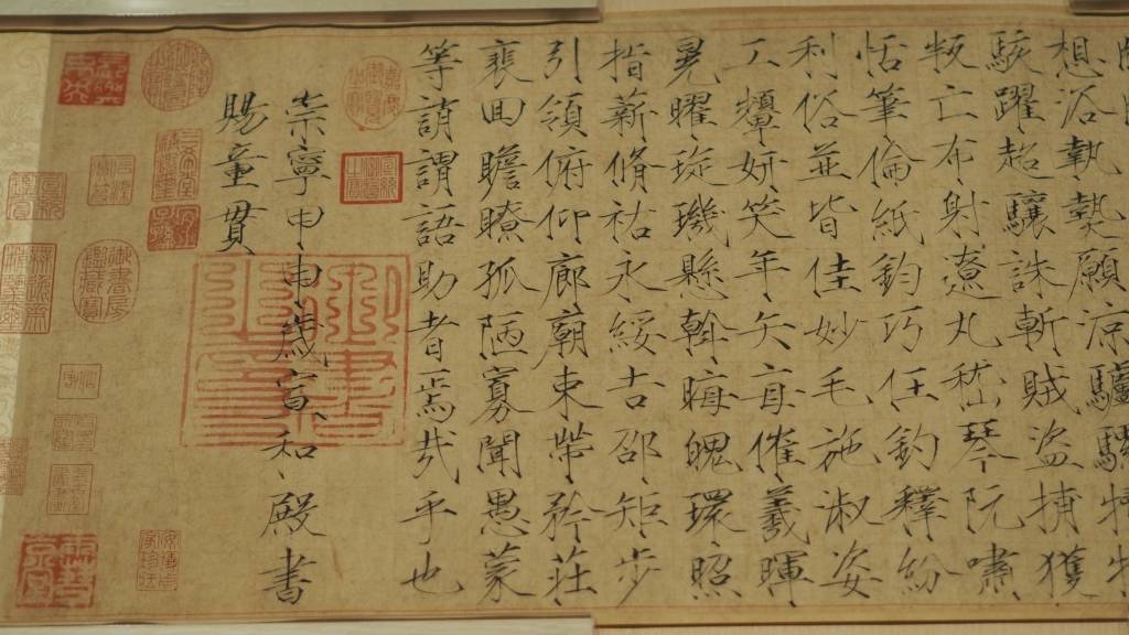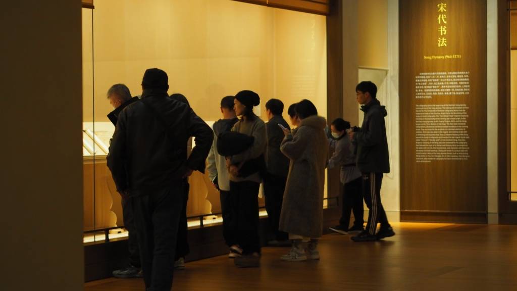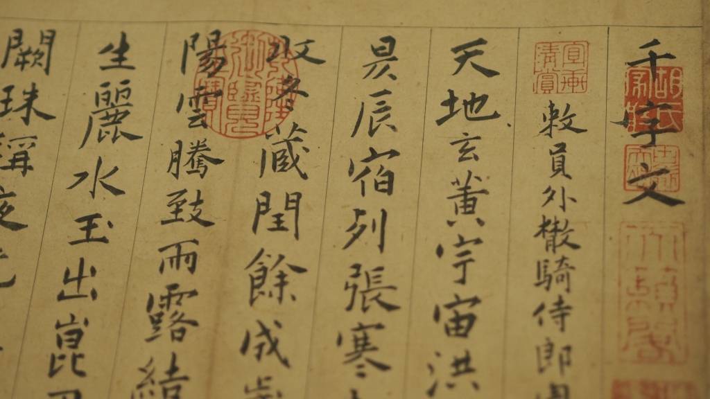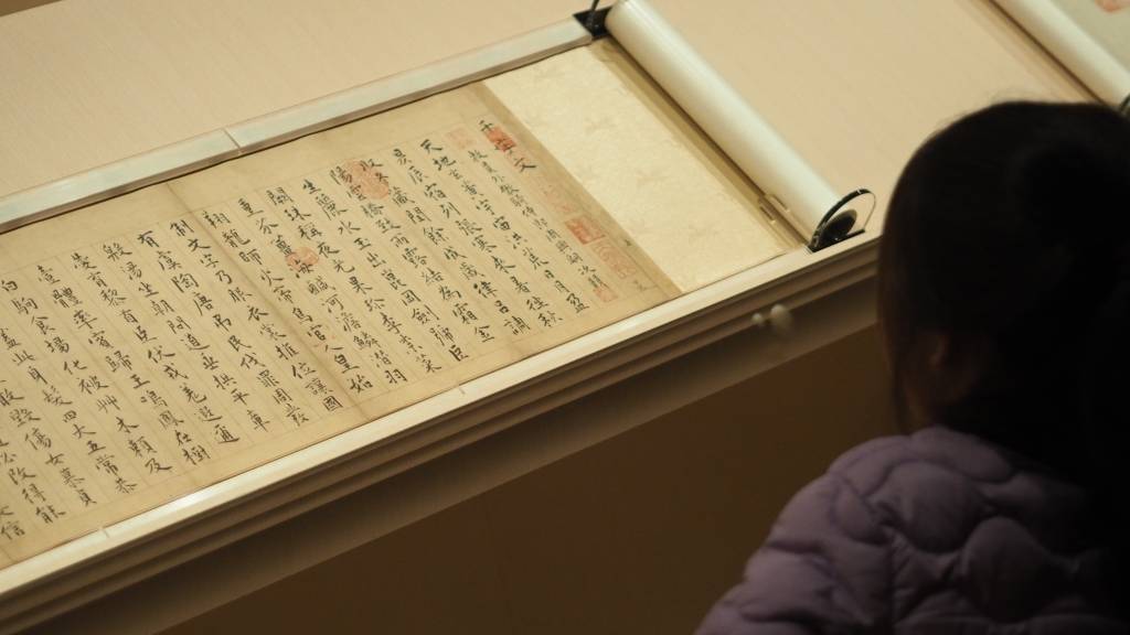 在北宋宋徽宗赵佶瘦金体《千字文》(即《楷书千字文卷》)的展台前,几位观众驻足欣赏,感叹笔法的精微。