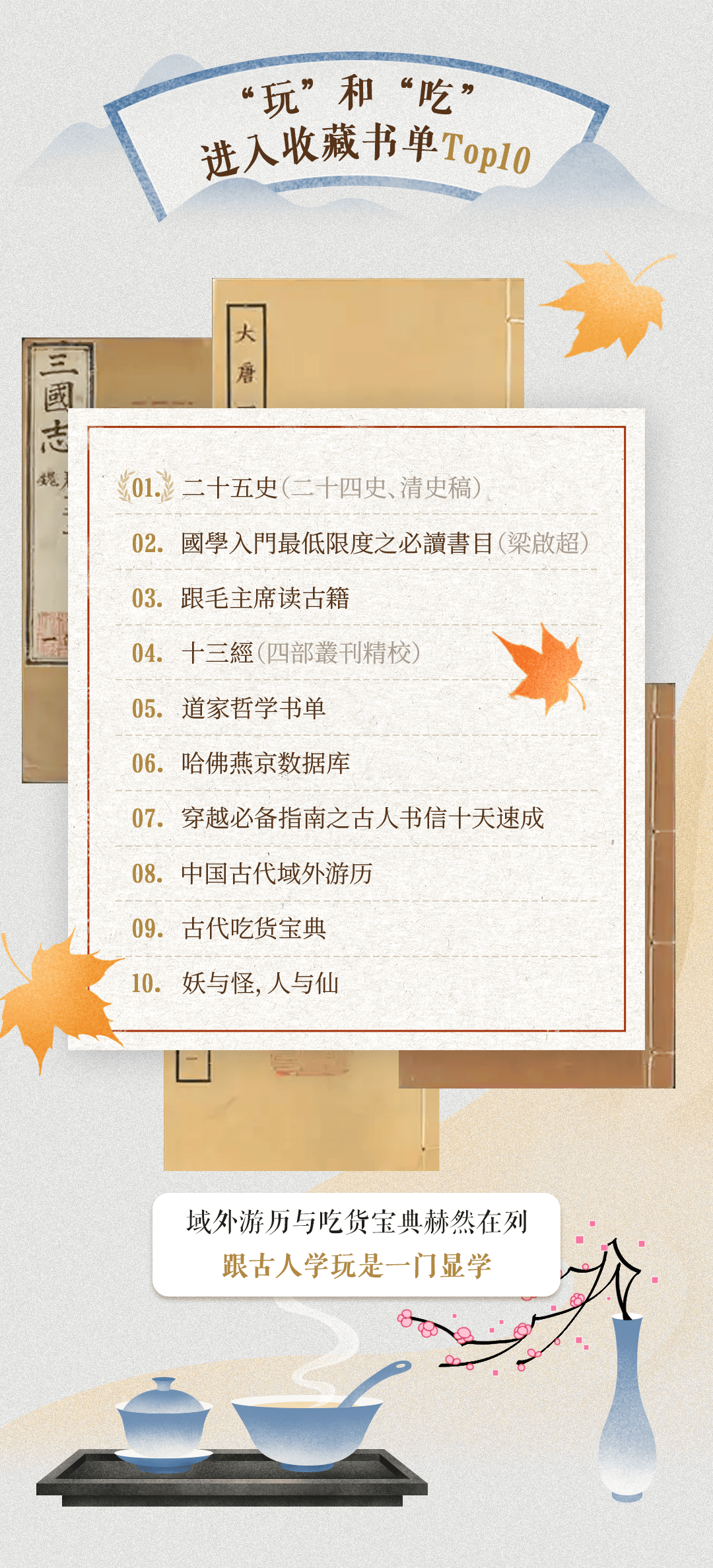 值得关注的是,“中国古代域外游历”“古代吃货宝典”等聚焦游历、美食主题的古籍书单也跻身榜单,从古籍中探寻古人“吃喝玩乐”之道成为一种热门趋势。