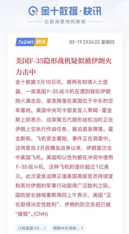 当地时间3月19号,CNN先爆了料:两名匿名知情人士说,一架美国F-35在伊朗上空执行任务时,被疑似伊朗的火力打了,之后慌慌张张降落在了中东的美军基地。