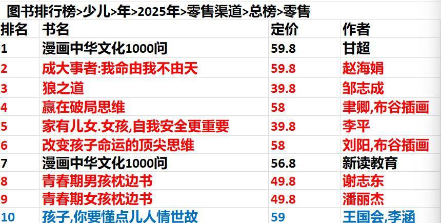 在郑重贴出的2025开卷少儿图书销量榜中,排名前五的书籍分别为《漫画中华文化1000问》《成大事者:我命由我不由天》《狼之道》《赢在破局思维》《家有儿女.女孩,自我安全更重要》。