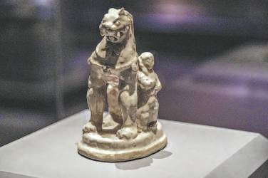 北朝时期的青釉胡人驯狮俑(大同博物馆藏)
