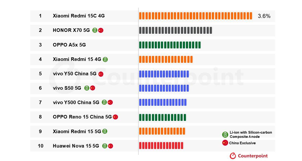 其中,小米旗下的 REDMI 15C 4G 凭借极高的性价比和全球供应优势,以 3.6% 的市场份额位居榜首。