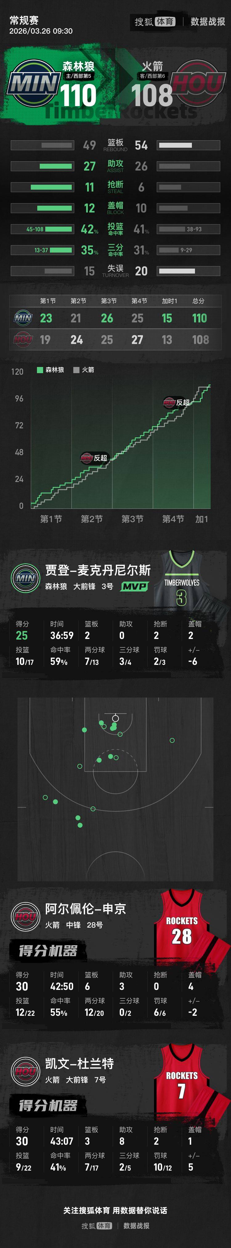 【搜狐体育战报】北京时间3月26日NBA常规赛,主场作战的森林狼以110-108加时击败火箭。