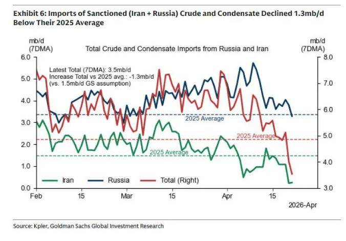 不受制裁的海上石油逼近历史低位、对俄罗斯石油的进口已低于2025年均值、而美国对伊朗的海运石油进口豁免到期未续期。