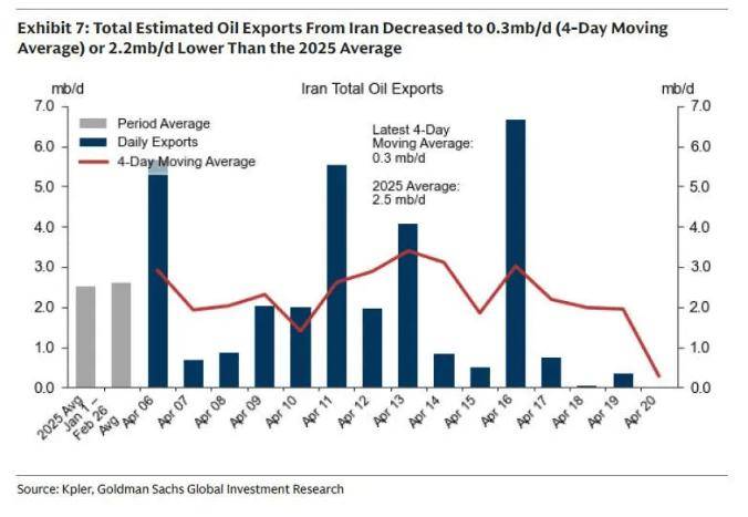 自4月12日美国实施海上封锁以来,伊朗石油出口减少260万桶/日,仅剩30万桶/日(4日移动均值)。