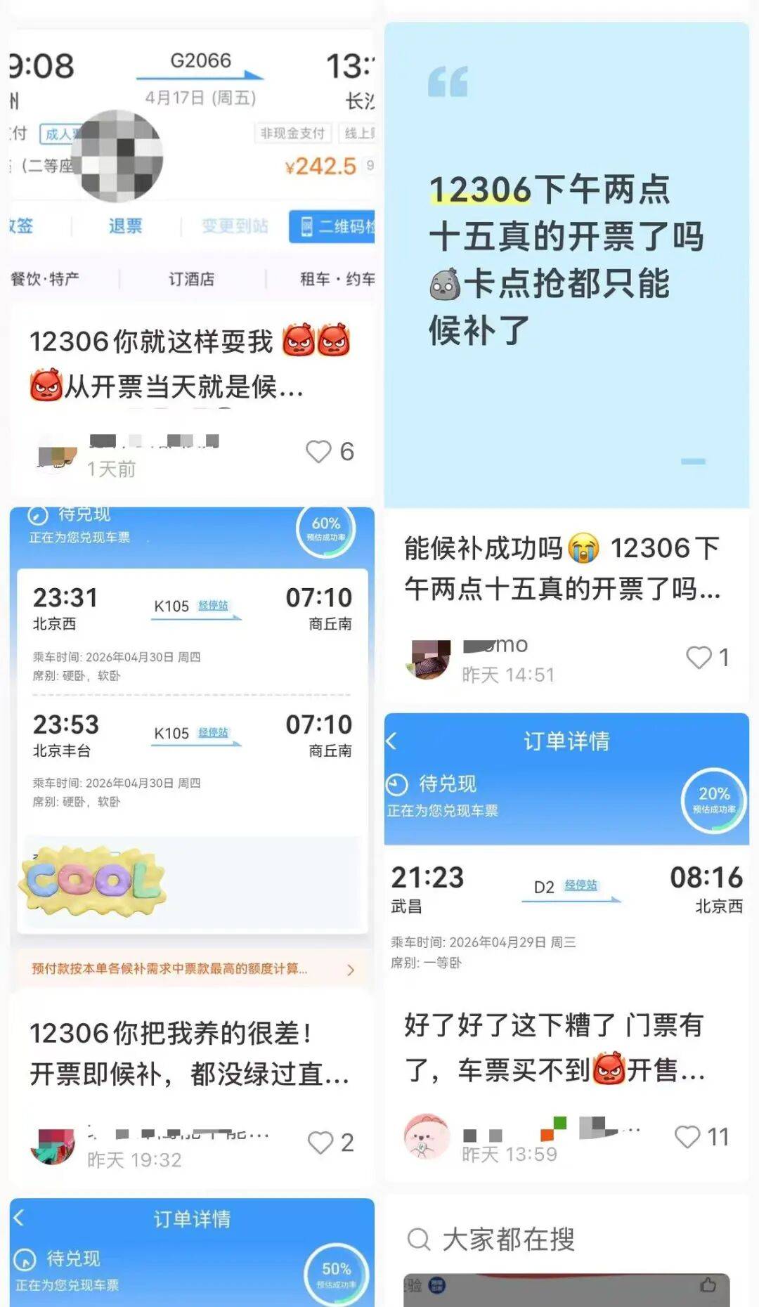 今年4月30日的票从4月16日起可以购买,4月16日一早,记者体验购买4月30日晚间北京发往广州南的火车票,虽然提前预填了信息,但依旧开票即候补,选中的四条线路都秒售罄。