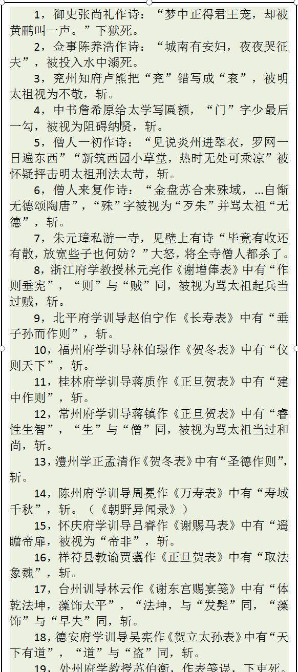 然而,纵观整个历史,明清时期的文字狱可谓达到了顶峰,尤其是明朝,几乎把这种文化压迫推向极致。