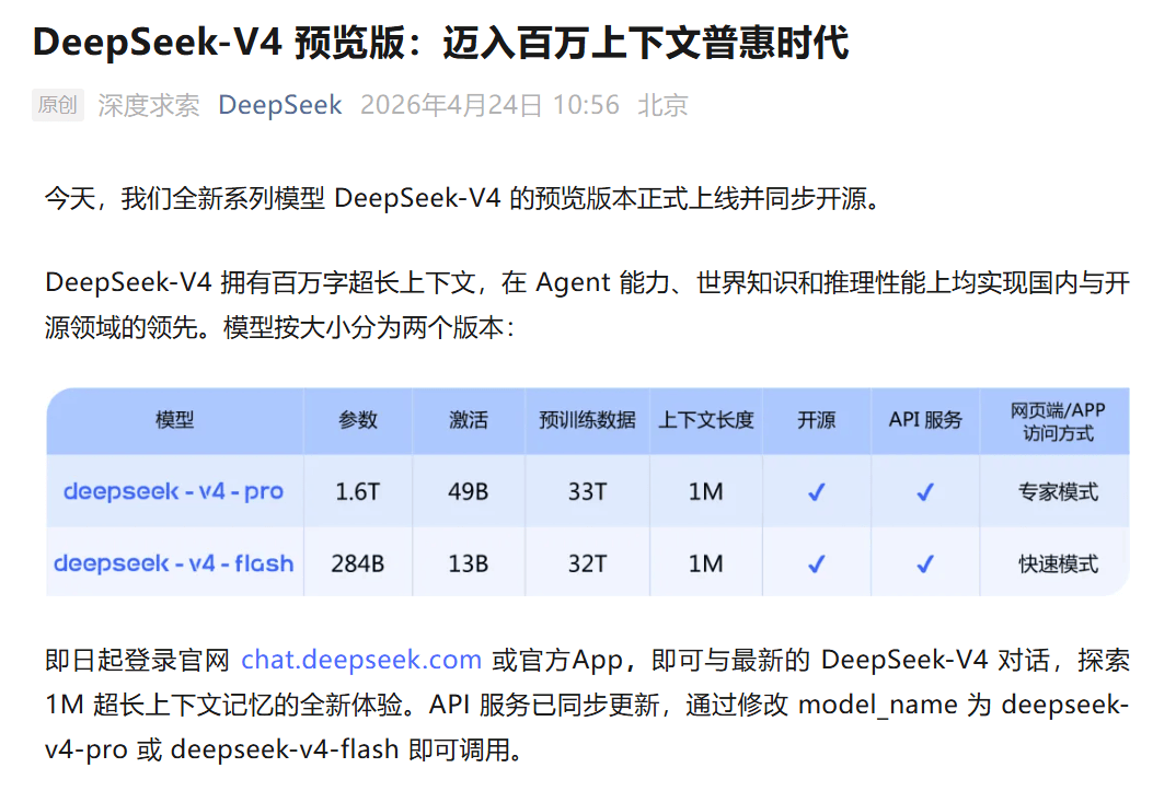 4月24日,DeepSeek全新系列模型DeepSeek-V4的预览版本正式上线并同步开源。